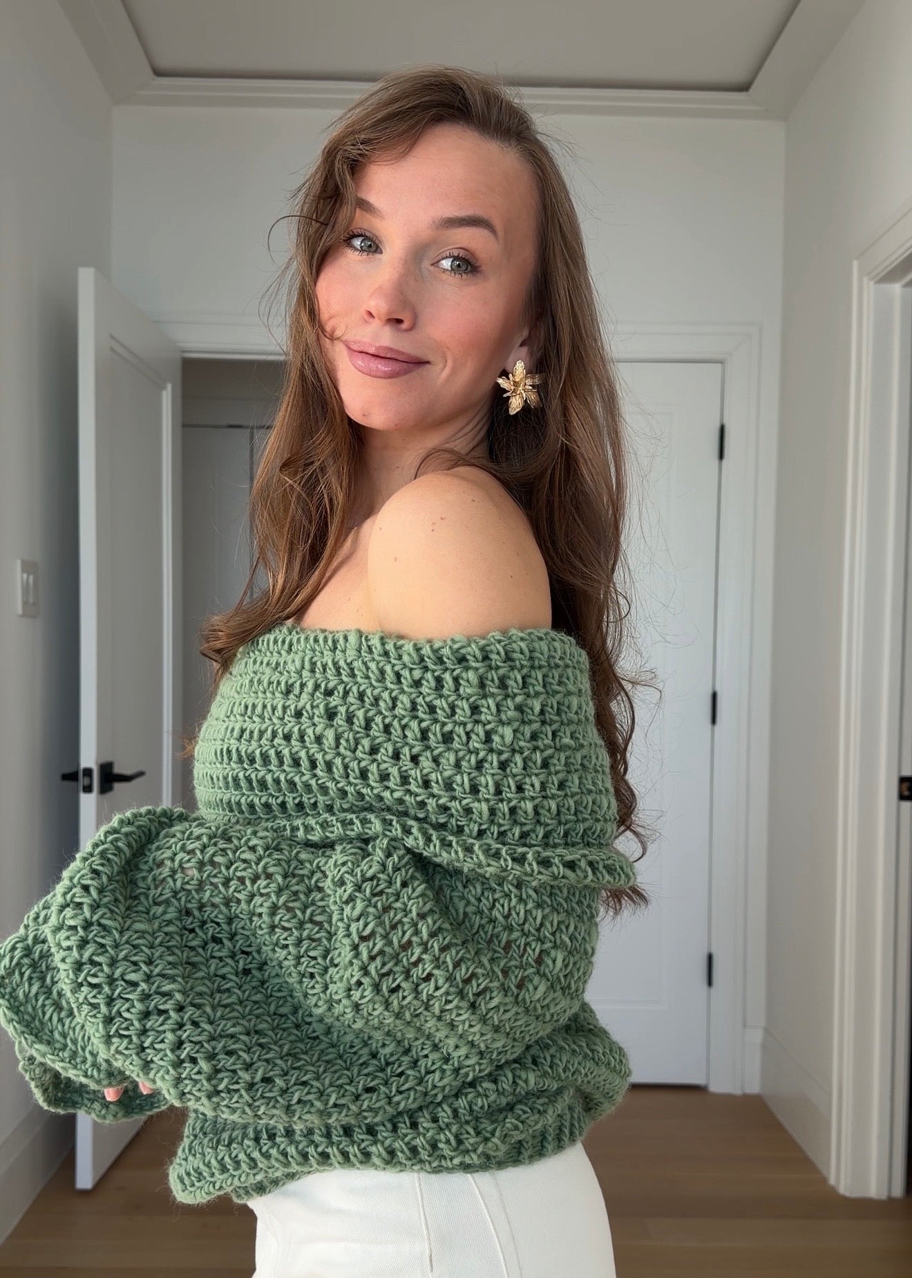 Learn to crochet a cozy off-shoulder sweater with a relaxed fit and soft drape.